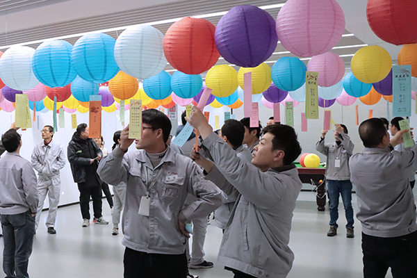同時,猜燈謎活動也在如火如荼地進行。為了讓員工更好地參與活動,特設置了一個主會場,兩個分會場。100個彩色燈籠懸掛整齊,200條謎語相映成趣,員工們或細看謎面、或冥思苦想、或小聲討論,猜出謎底的員工歡呼雀躍地去領取“戰利品”。全場最厲害的員工猜對了15條燈謎,欣喜地將大獎收入囊中,其他員工也帶著禮品盡興而歸。