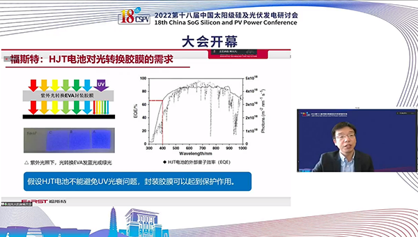 2022年12月8日至10日,第十八屆中國太陽級硅及光伏發(fā)電研討會(18th CSPV)在山西太原舉行。本次會議采取線上論壇的形式召開,福斯特等光伏企業(yè)協(xié)辦。在會議首日主會場論壇中,福斯特總經理周光大博士針對光伏市場主流的新電池技術闡述了福斯特的理解,提出了專業(yè)的解決方案,并做了題為《新型高效電池的封裝方案》的報告。