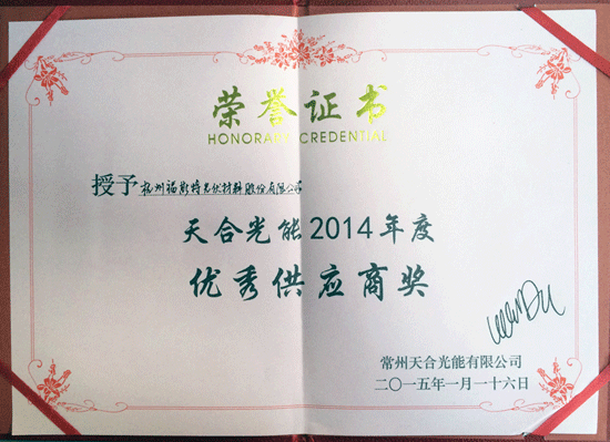福斯特榮獲天合光能2014年度優秀供應商獎