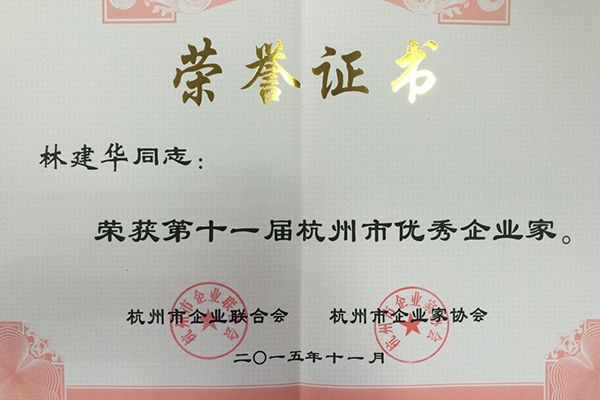 第十一屆杭州市優(yōu)秀企業(yè)家榮譽(yù)證書